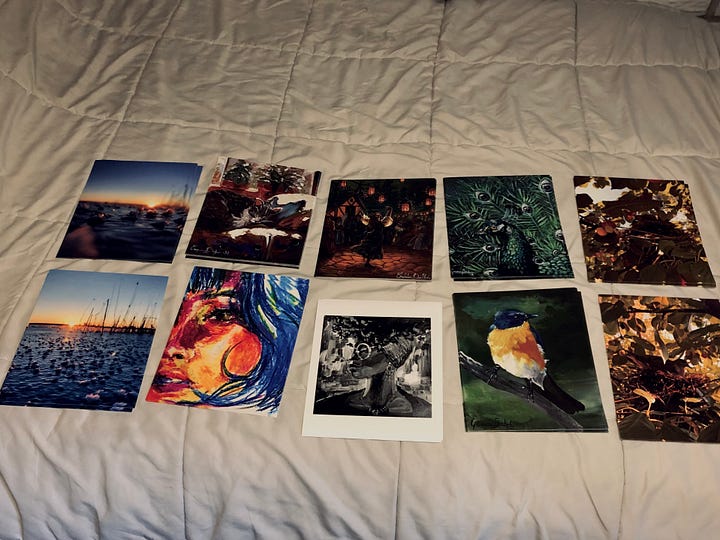 In August, I designed business cards for myself and began making prints of my artwork to sell at Riverboat Days. The process was longer and more expensive than I had anticipated, but I was thrilled with the final results of the prints and cards. I also got to set up a small collection of my art for a gallery!