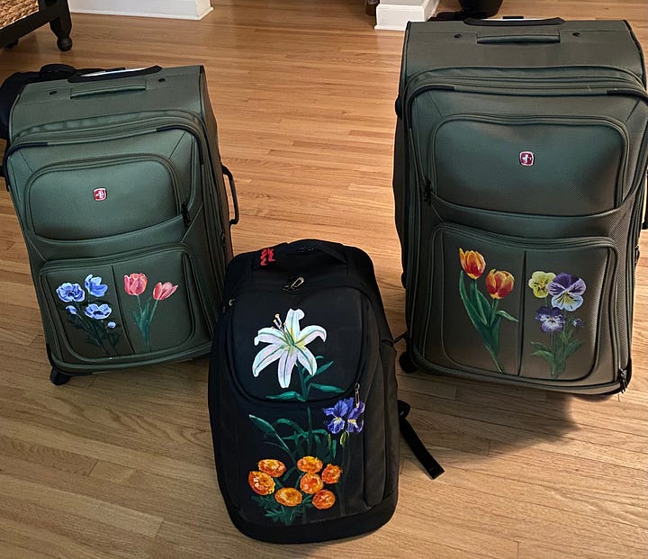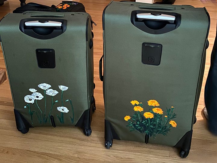 My final week in the States was bittersweet, with many goodbyes and packing twenty years into four bags. I took photographs of everything that I had to pack, just in case I lost one of the bags, and I painted the bags too, so I’d be able to find them better when I was at the baggage claim. I also brought my bird to my sister’s house, and he seemed to be getting along with her bird.
