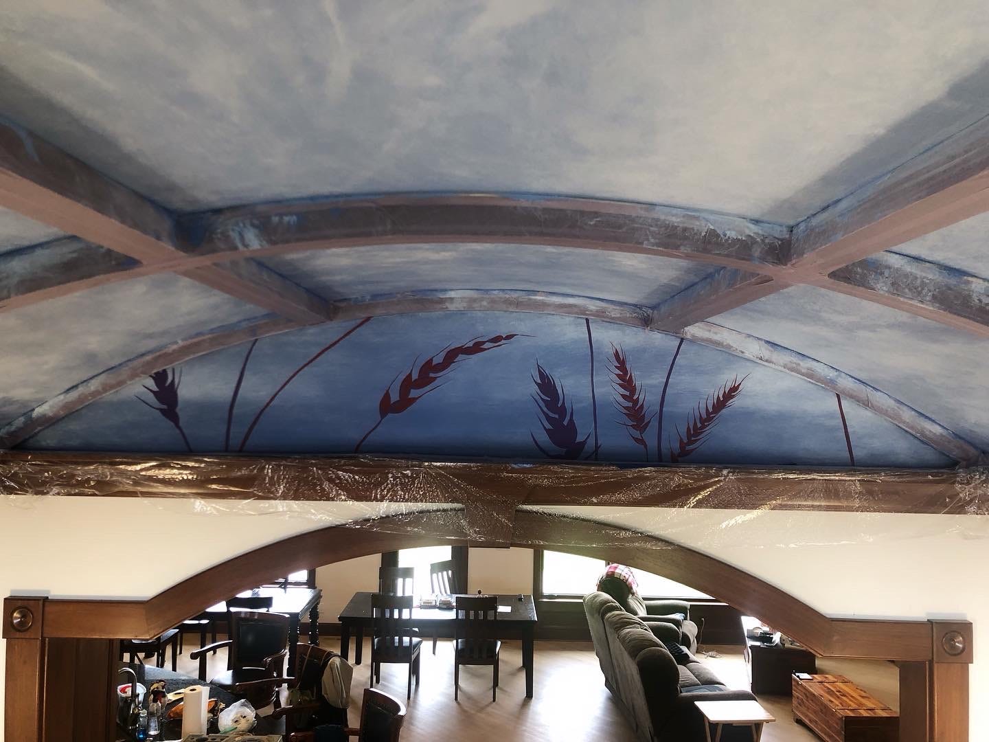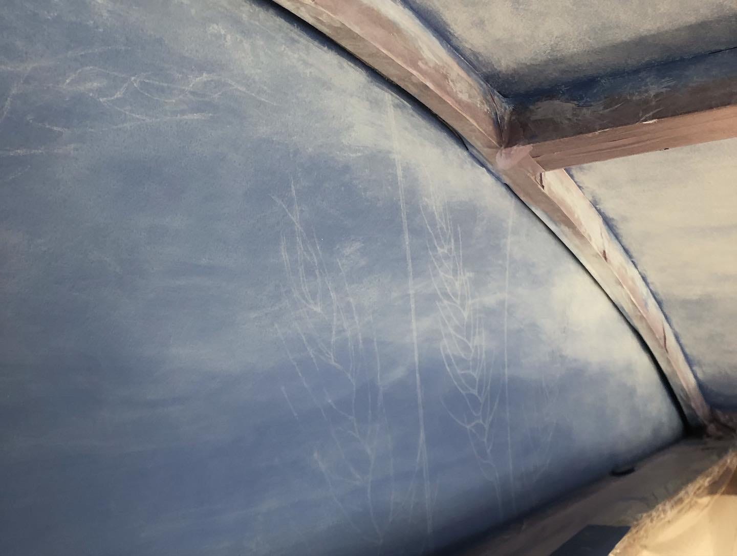 This week we continued the entryway mural. As you can see above it’s really starting to come together now! All of the planning and just messing with it are paying off! The painting looks arguably better in photos, so we’ve been looking at pictures of it to see how to improve. Today we started the underpainting of the wheat on the vertical panel. On Monday we will start painting the details in the wheat.