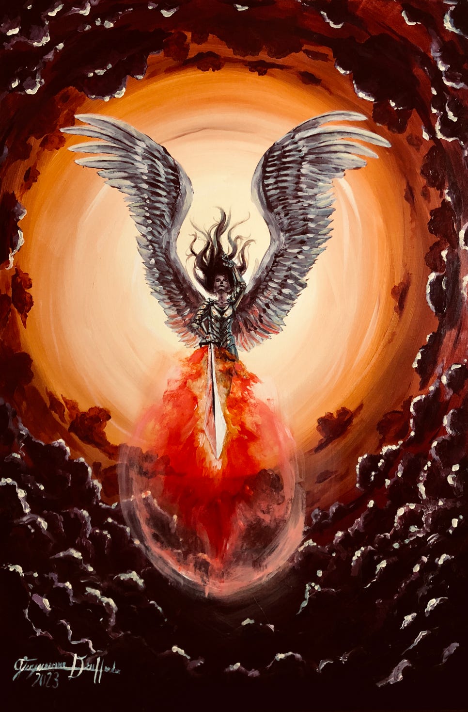 “A Calm Fury for Justice” presents an armor-wearing, flaming sword-carrying, humanoid angel. She rises above the dark clouds swirling all around her, and the sun highlights her flowing brown hair. The viewer is given a stark perspective, with the flaming sword seeming to reach towards them. Overall this grew my perspective skills, as well as the detailing on the wings, face, and armor. I am truly proud of this piece and it is the largest piece of artwork I have ever created, coming in at 36x24”.