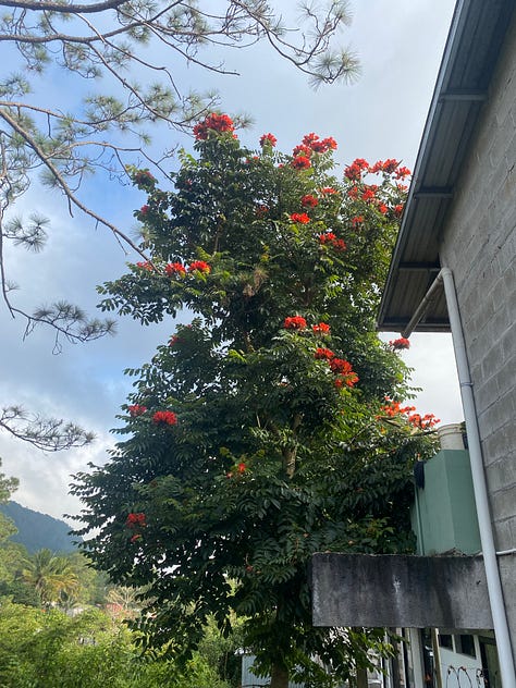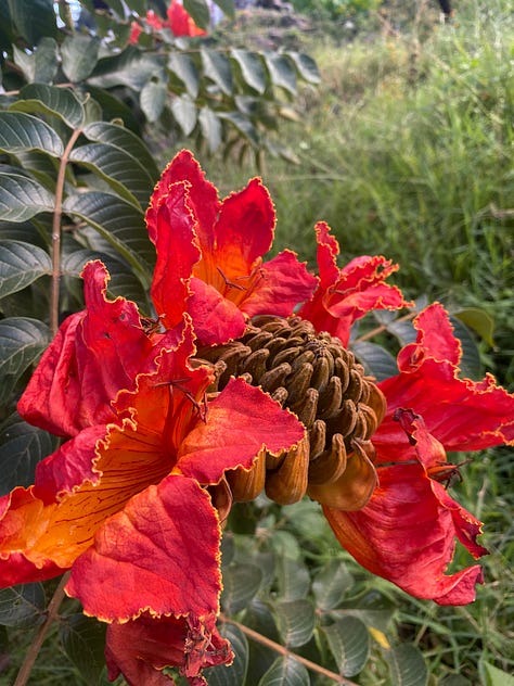 I’ve also been taking a lot of pictures of the different plants here! Right now, since it’s the rainy season, there are all of these trees with huge orange flowers on them called the African Tulip Tree (pictured in the middle and bottom right). It reminds me of the fall colors back in South Dakota, although now they have the first snow back there!