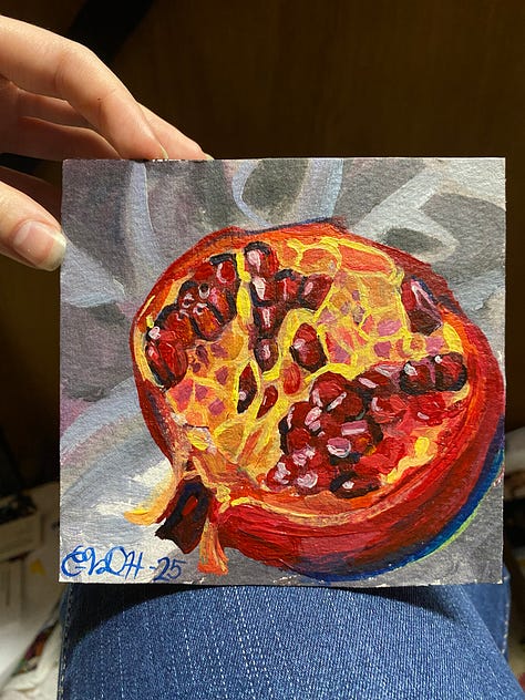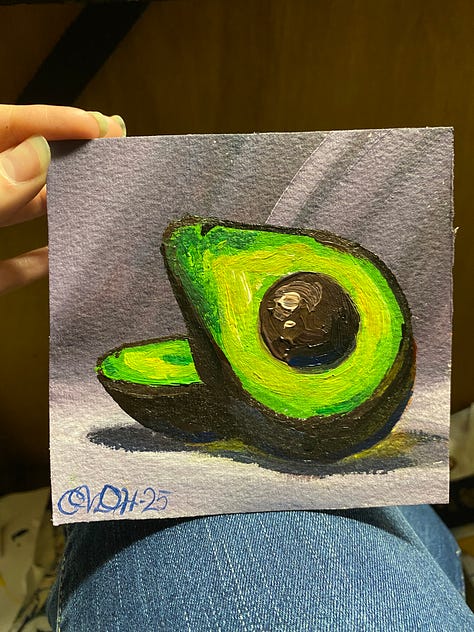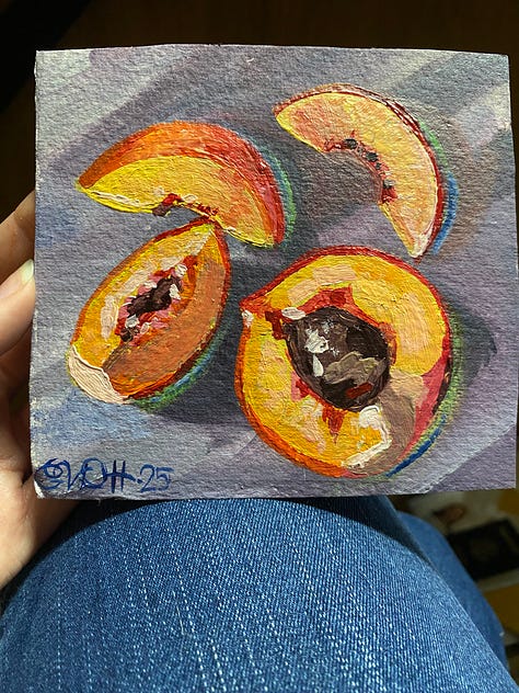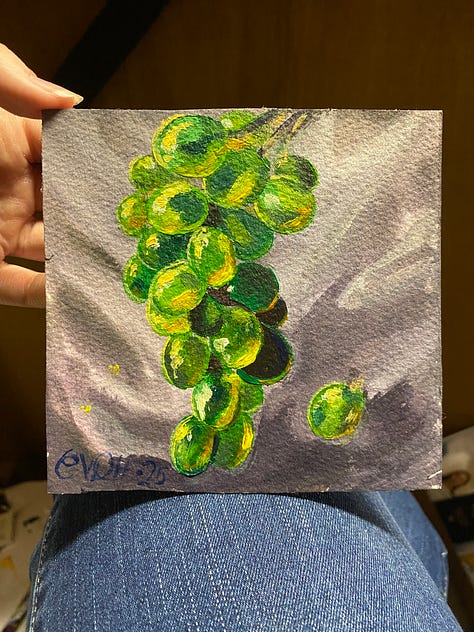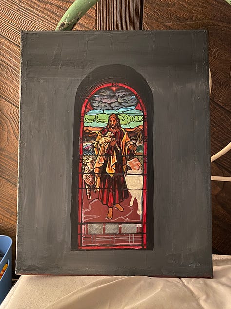 The artist in me is also excited to finally have a house that is mine and his to decorate, so I’ve been working on a few different paintings as a way to procrastinate doing the rest of my packing. As a way to take part of my church with me, I’ve been working on a replica of the stained glass window in the front. This Sunday will be my last Sunday there. I’ve also done some fruit, and I’m going to wait to show you the final one until I have it hanging up in my new home!